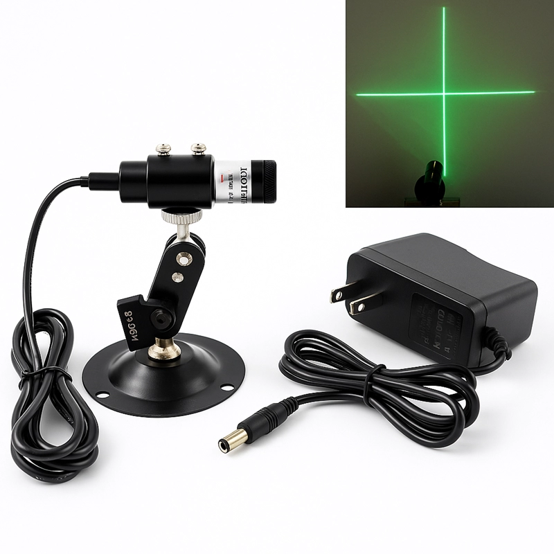 Láser de Guía Cruzado Verde para Corte Preciso 360 que proyecta una luz verde en forma de cruz que marca de manera visible las líneas de corte horizontal y vertical sobre la tela, permitiendo realizar cortes perfectamente rectos y alineados. Es ideal para talleres de confección, fábricas textiles y espacios con alta iluminación donde se requiere máxima visibilidad y precisión.